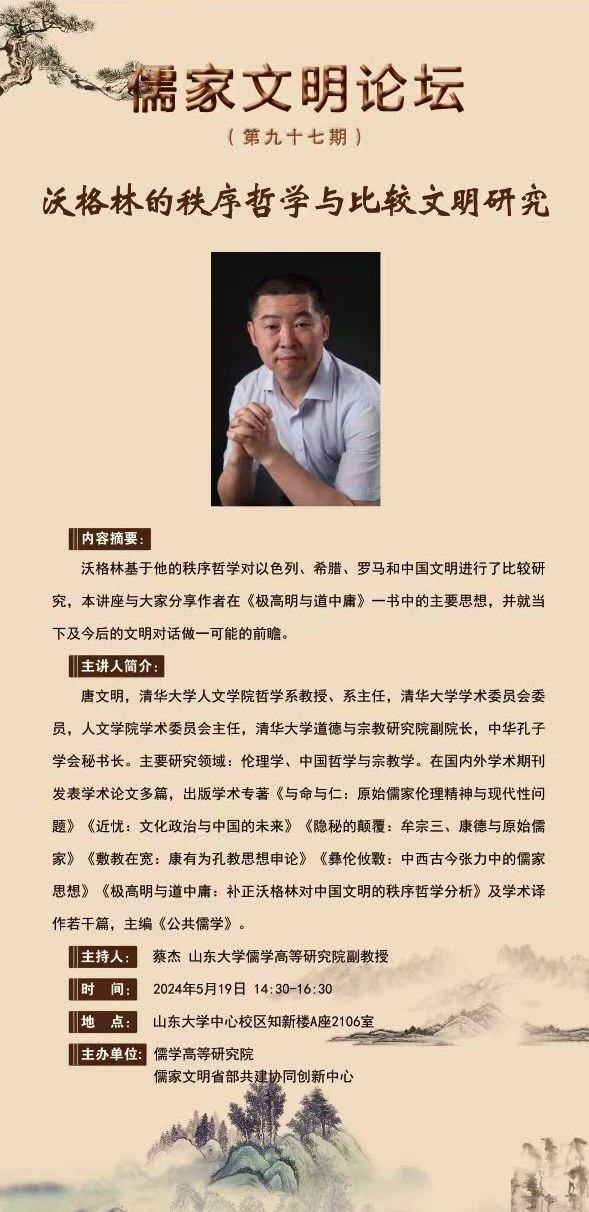 讲座预告 | 儒家文明论坛第九十七期:沃格林的秩序哲学与比较文明研究