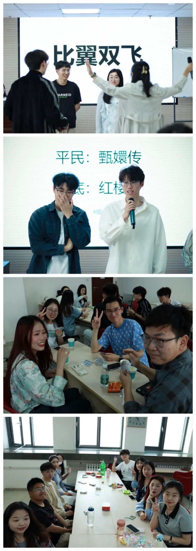 交流环节结束后,活动进入了轻松愉快的游戏环节。在“你画我猜”游戏中,同学们用画笔和想象力展现了传统文化的独特魅力;“谁是卧底”游戏中,精彩刺激的逻辑推理进一步锻炼了同学们的思辨能力与语言能力;“听歌识曲”的经典旋律唤起了大家对传统文化的共鸣;在“阿瓦隆”“狼人杀”“保皇”“够级”和“UNO”等游戏中,工科学子缜密的逻辑思维和文科学子欢脱跳跃的性格展现得淋漓尽致;“不要做挑战”这一趣味环节将游戏环节推到了高潮,同学们互相引导对方说出关键词汇或做出关键动作,现场笑声迭起。最后,活动在激动人心的抽奖环节中落下帷幕。
