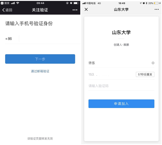 (3)点击 【关注身份验证】以下页面。输入手机号码点击下一步→输入姓名和手机号码并获取验证码,点击申请加入,待管理员审核通过之后进入第四步。