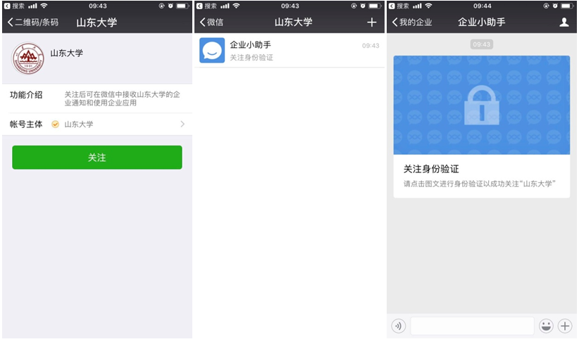 (2)扫描二维码进入以下页面。关注→企业小助手→关注身份验证。
