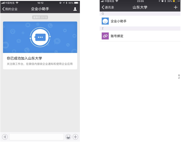 (4)在统一身份认证平台输入账号密码,登录成功后跳转到账号绑定成功页面,加入企业微信成功(加入成功后,可以扫描企业微信二维码,即可从微信中使用企业微信)。