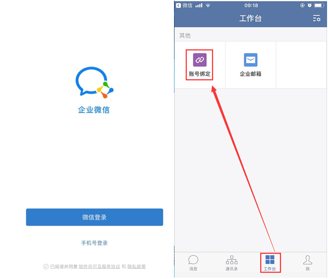 (3)第一次进入需要下载微信企业微信APP。微信登录→工作台→账号绑定。