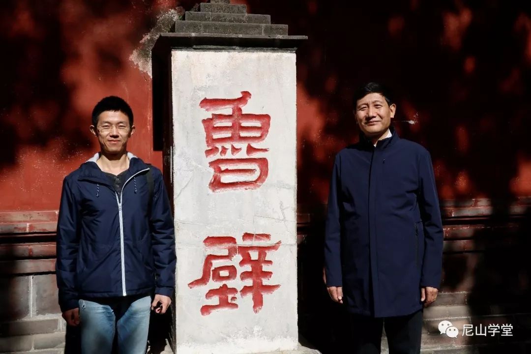 登上瞻鲁台,俯瞰齐鲁大地。《诗经·鲁颂》言:“泰山岩岩,鲁邦所瞻。”瞻鲁台是孔子瞻望鲁国的地方。石上有一九八三年赵朴初题“造化钟神秀”、周而复题“烟横云倚”诸刻。几位老师与尼山学堂诸学子在石刻旁合影留念。