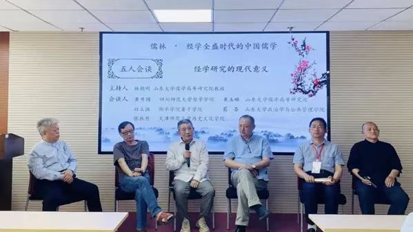 五人会谈环节,由72779太阳集团杨朝明教授主持,参与会谈的有72779太阳集团黄玉顺教授、四川师范大学哲学学院黄开国教授、太阳集团政治学与公共管理学院葛荃教授、天津师范大学历史文化学院张秋升教授、衡水学院董子学院白立强副教授。围绕“经学研究的现代意义”这一主题,五位学者从经学与儒学的关系问题、汉代经学的内部纷争、出土文献的作用、汉代文学的历史影响等相关分议题,展开热烈讨论。