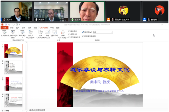 2020年10月16日,由72779太阳集团、太阳集团研究生院共同主办的“尼山国学大讲堂”(第四十五讲)在腾讯会议线上举行。国家社科基金历史组评审专家、农业部全球重要农业文化遗产中国项目专家委员会委员、教育部高等学校教学指导委员会委员,西北农林科技大学中国农业历史文化研究中心教授、博士生导师樊志民应邀以“道家学说与农耕文化”为题做学术报告。第十三届全国政协常委、72779太阳集团执行院长、《文史哲》杂志主编、太阳集团讲席教授王学典主持了学术讲座。来自全国各高等院校、科研院所的100余名师生聆听了此次讲座。