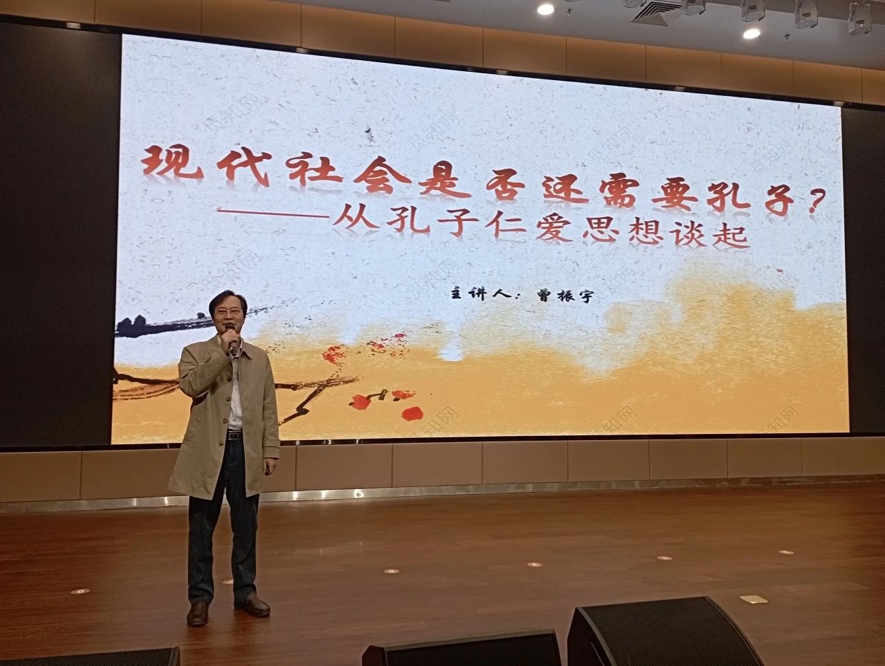 会后,曾振宇作题为《现代社会是否还需要孔子——从孔子仁爱思想谈起》的学术讲座。他指出百年未有之大变局的时代背景下,我们能为全世界奉献的最具权威性、普遍性的理念和中国智慧,就是孔子的“仁”。“仁”作为孔子思想体系中最核心的观念,具有不可言说性,是人的内在普遍本质,而“仁者安仁,知者利仁”更是代表了孔子仁学所臻至的最高哲学水平。他向大家详细介绍了历代孔子画像和历代学者对孔子的评价,认为孔子的《论语》是每个人的必读书,并向大家展示了他的最新学术成果《论语解诂》。谈及孔门弟子对儒学的继承和发扬,曾振宇指出,曾子是孔子弟子中唯一一位著述得到相对完整保留的弟子,他弘扬了儒家的君子人格,传承了孔子的孝道,对儒学的发展有着重要贡献。孔子对曾子讲“吾道一以贯之”,曾子随后以“忠恕”释仁,并且从知行关系的功夫论层面诠释仁学。同时,曾子也以“慎独”的方式贯通“忠恕”。讲座最后,曾振宇与诸位参会嘉宾和现场听众进行了互动交流。