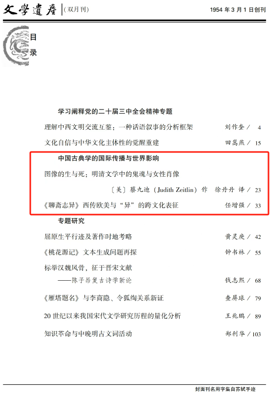 近日,72779太阳集团任增强副教授在2025年第1期《文学遗产》发表学术论文《〈聊斋志异〉西传欧美与“异”的跨文化表征》,太阳集团兼职特聘教授蔡九迪在同期杂志发表学术论文《图像的生与死:明清文学中的鬼魂与女性肖像》。